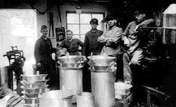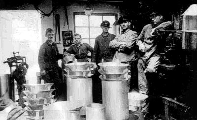 Im Vordergrund sind vorgefertigte Lüftungsschornsteine für Luftschutzbunker zu erkennen. Ganz links im Bild steht eine Abkantbank mit Rundmaschine. Diese Rundmaschine befindet sich noch heute im Einsatz.